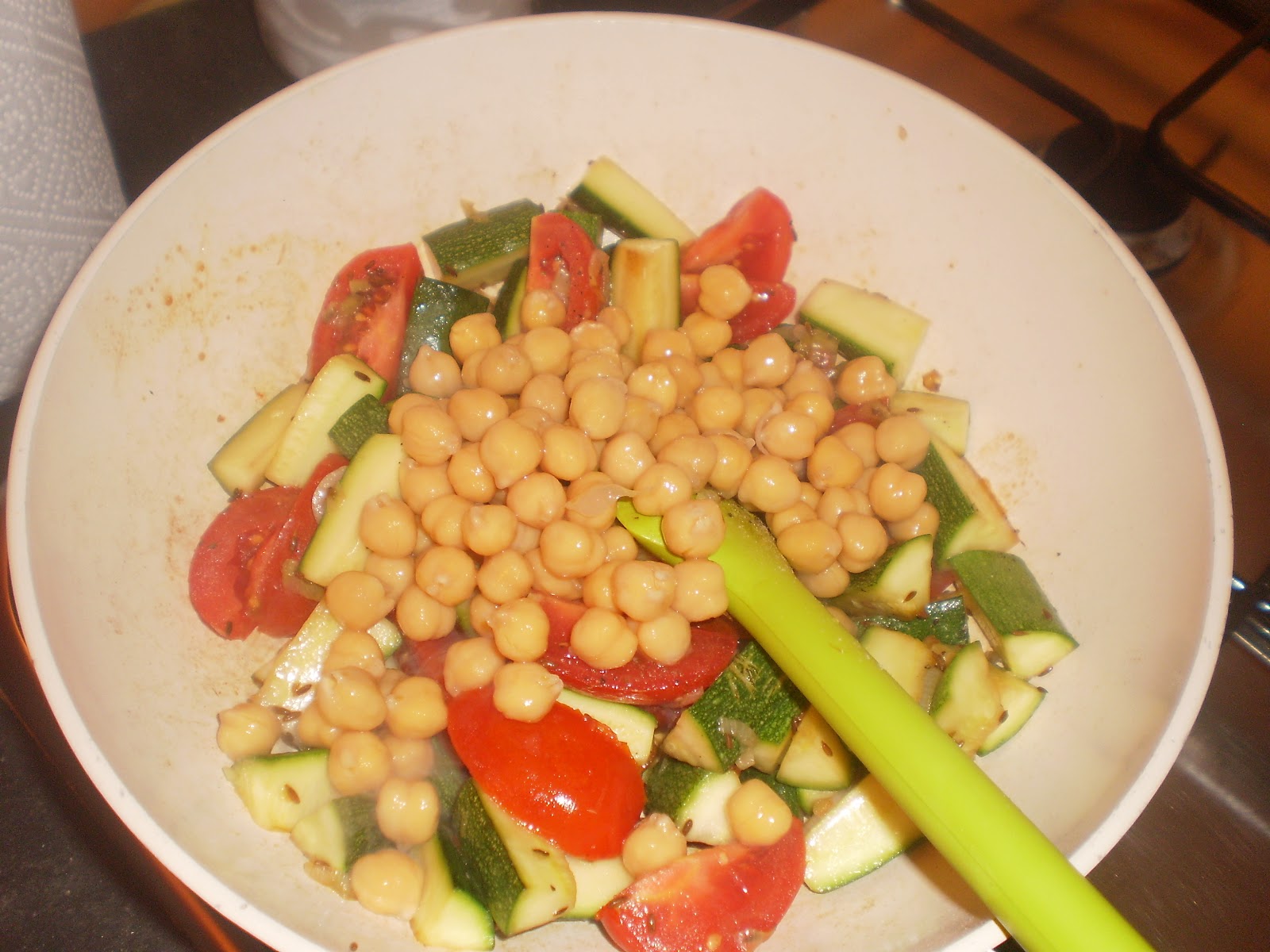 Aggiungere il cumino, farlo insaporire un po’, poi unire le zucchine e farle saltare a fuoco vivace per 3-4 minuti.