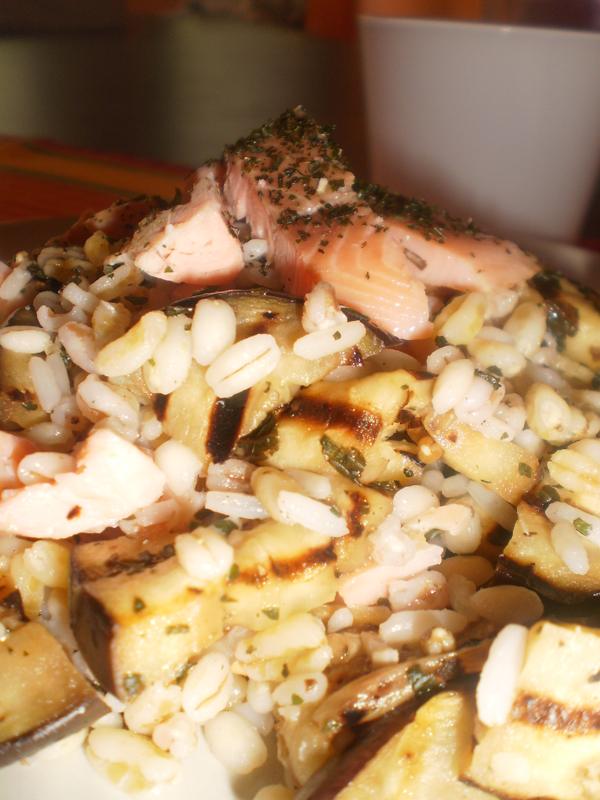 Nel frattempo, tagliare la melanzana a fette non troppo sottili e grigliarle in una bistecchiera bella calda. Tagliare le fette grigliate a pezzetti e riunirle in un insalatiera.