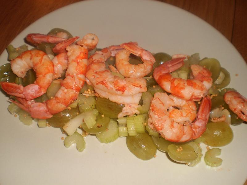 Spegnere, prelevare i gamberi dalla padella e servire sul letto di insalatina di uva e sedano.