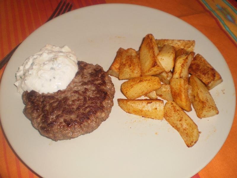 Cuocere gli hamburger sulla bistecchiera rovente e servirli accompagnati dalla salsa, insieme alle patate alla paprika.