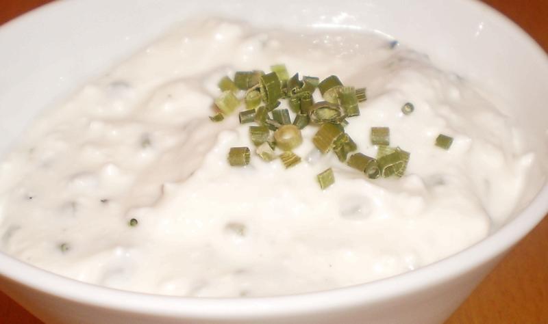 Frullare insieme feta e yogurt e aromatizzare con erba cipollina e pepe.