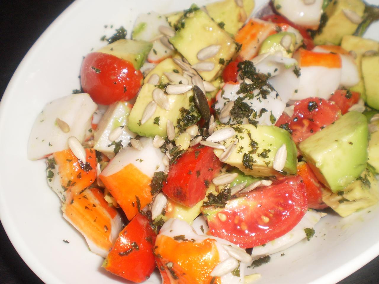 Festeggiamo questo primo mese insieme con una fresca e semplicissima insalata di surimi (eh già, lo chiamiamo con il suo nome, senza spacciarlo per polpa di granchio) che, nella sua dubbia origine, secondo me nelle insalate ha comunque una sua dignità.