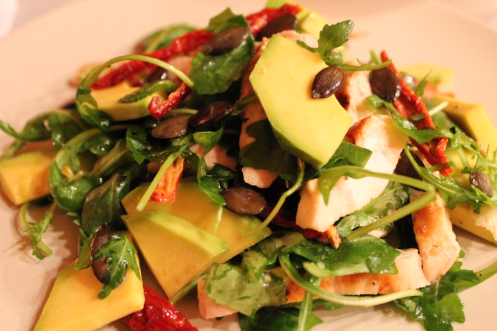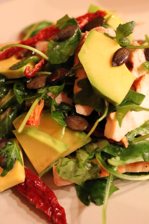 Tagliare il pollo e i pomodori secchi a striscioline e riunire insieme agli altri ingredienti in un’insalatiera.