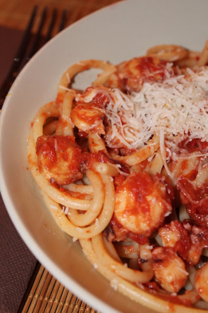 Vi risparmio la ricetta del risottino in bianco molto all’onda che ci siamo gustati ieri sera, grandi e piccini, e vi svelo invece cosa mi sono inventata con l’altra metà di polpo che abbiamo “vitualmente” cucinato insieme ieri. Non me ne vogliano i puritani del bucatino all’amatriciana, ma questa versione marinara preparata sulla falsariga della celeberrima versione originale ci è piaciuta davvero tanto! E ci stava bene anche la pioggia di pecorino romano. Provatela e fatemi sapere!