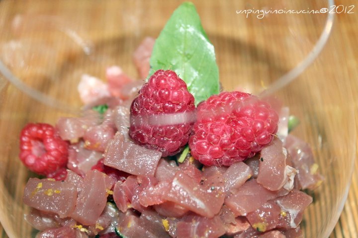Dell’abbinamento tonno-lamponi avevo letto da qualche parte ma non avevo idea di come condire il tutto. Beh, vi assicuro che il basilico non ci sta solo bene, ci sta divinamente e il risultato è assolutamente da provare!