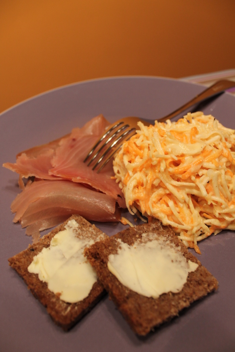 Cioè, sarebbe dovuto essere coleslaw, l’insalatina di origine anglosassone che generalmente viene usata per accompagnare carni e pesce alla griglia, ma che secondo me ben si sposa anche con il pesce affumicato per un antipasto diverso dal solito. Dico “sarebbe” perché ieri sera, dopo averlo preparato mi sono resa conto che ci andava il cavolo cappuccio e non il sedano rapa! Infatti, l’ultima volta lo avevo fatto con il cavolo cappuccio… A quel punto, però, era già in frigorifero e stavo preparando i piatti e, ovviamente, non avevo del cavolo cappuccio in casa perché avevo acquistato appositamente un bel bulbo di sedano rapa. Ma sapete che vi dico? Era squisito anche così! Perché in cucina la fantasia è d’obbligo e la ripetitività è bandita. E così, anche il coleslaw, una volta lo fai con il cavolo cappuccio, la volta dopo con il sedano rapa, quella dopo ancora con il cavolo nero oppure, se ti va, ci metti un po’ di mela. Perché non è forse vero che la cucina deve essere una scoperta continua? ;o)