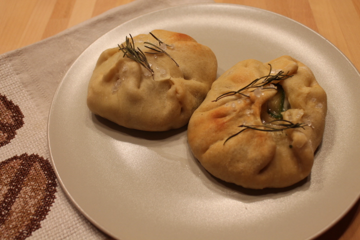 - Ricoprire con un po' di sale grosso e un rametto di rosmarino e cuocere in forno caldo a 200° per una mezz'oretta circa (saranno pronti quando la pasta della pizza sarà bella croccante e inizierà a dorarsi). Io per motivi organizzativi li cuocio sempre nel microonde funzione crisp per 10 minuti e vengono perfetti.