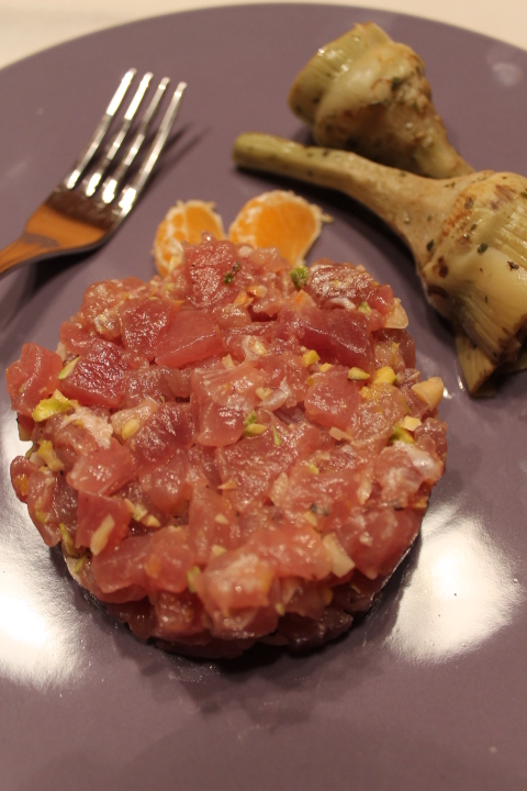 Caloriferi accesi da ieri (in ufficio e a scuola, a casa ancora riusciamo a resistere), cambio stagione negli armadi in corso d’opera (lo so, sono un po’ in ritardo, ma che stress ogni volta! poi ora che siamo in 4 in famiglia…), voglia di piumoni avvolgenti, tisane fumanti, cibi “coccolosi”. Eppure l’altro giorno, quando mi sono ritrovata tra le mani un bel filetto di tonno fresco fresco non ho saputo resistere al richiamo della tartare. Però ho utilizzato i primi mandarini della stagione. E mi sono detta: al massimo dopo mi faccio una bella tisana digestiva! ;o)