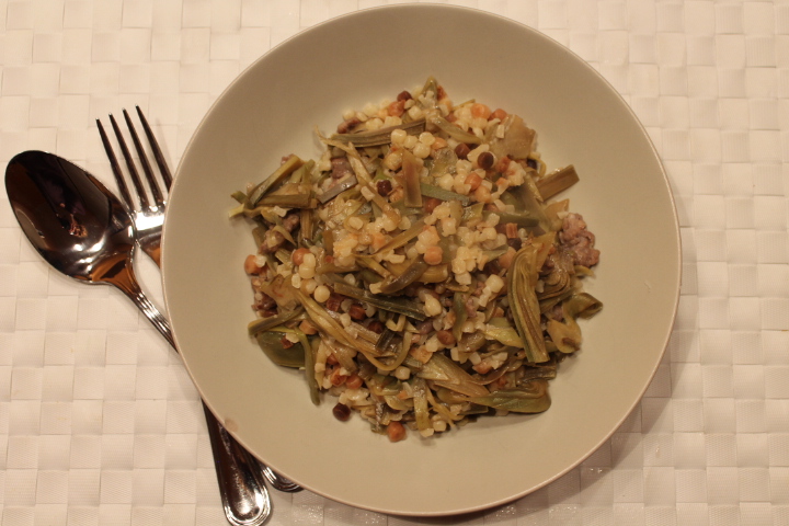 - Nel frattempo, rosolare la salsiccia spellata e sminuzzata in un'ampia padella senza aggiunta di condimenti. Unire anche i carciofi e portare a cottura con, eventualmente, un goccio di acqua di cottura della fregola (devono restare croccantini!).