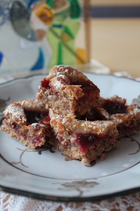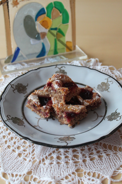 Come promesso, per il mio post di auguri natalizi vi presento una delle ricette dei biscotti natalizi della mia Mami, i Linzer Schnitten, i miei preferiti. In pratica, la versione “mini” della famosa Linzer Torte austriaca. Ricetta antica risalente al 17. secolo che consiste in una frolla fatta, in parte, con farina di nocciole (molti usano le mandorle, ma casa mia abbiamo sempre utilizzato le nocciole), che viene ricoperta con marmellata di mirtilli rossi e decorata con una graticola di frolla (come per la crostata). La differenza rispetto alla torta consiste nel fatto che in questo caso viene fatta in una teglia e poi tagliata a quadrotti. Il vantaggio è che si conservano e si mantengono morbidi a lungo (noi li conserviamo nelle tradizionali scatole di latta) e, anzi, il giorno dopo e quelli successivi sono ancora più buoni!
