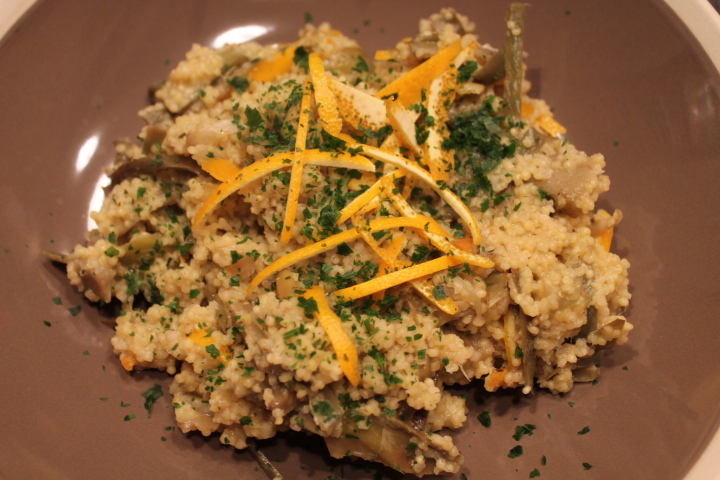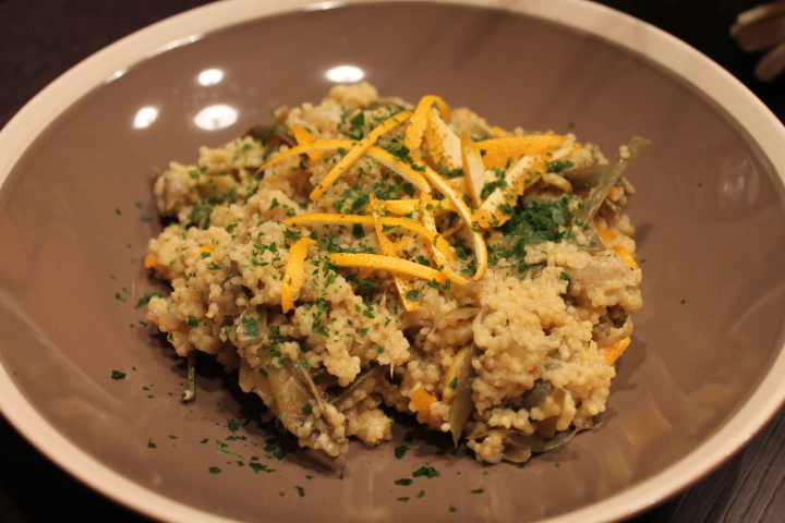 - Eliminare l'aglio e aggiungere il miglio, lasciarlo tostare e sfumare con mezzo bicchiere di vino bianco. Portare a cottura aggiungendo brodo vegetale ogni volta che si asciuga (attenzione che assorbe molto più liquidi del risotto!). Ci vorranno circa 20 minuti. Al termine della cottura, spegnere la fiamma, aggiustare di sale e mantecare con un cucchiaio di parmigiano grattugiato, le scorzette di arancia e il prezzemolo tritato. Coprire e lasciare riposare qualche minuto.