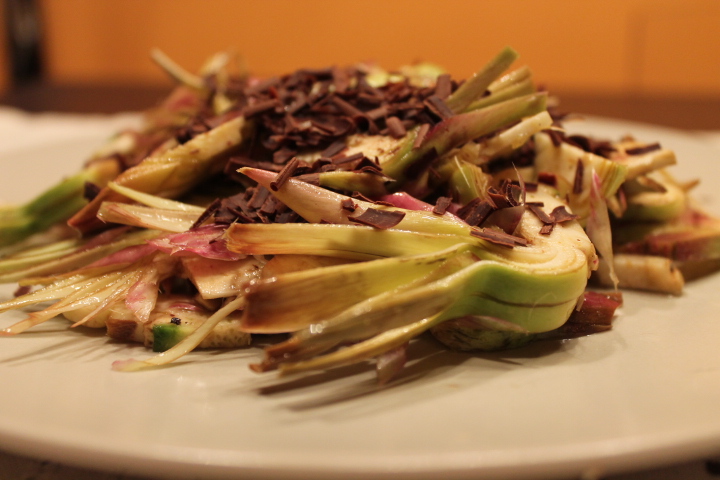 Disporre l’insalata di carciofi nei piatti e completare con il cioccolato a scagliette.