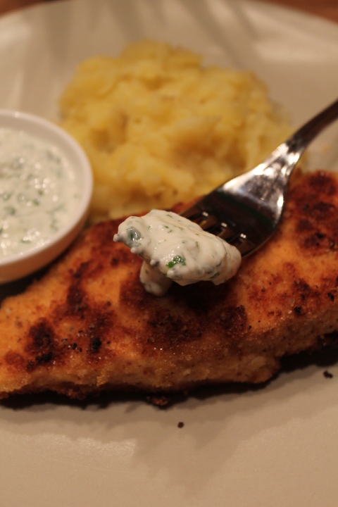 4. Nel frattempo, preparare la salsa al cren: unire tutti gli ingredienti in una ciotola e lavorarli fino ad ottenere un composto omogeneo. Aggiustare di sale.