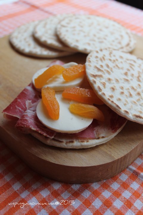 1. Vi dico anche come le ho preparate? Ma sì va...allora: scaldare le piadine su una piastra rovente e coprirle prima con la coppa, poi il formaggio e infine qualche pezzetto di albicocca secca. Chiudere e lasciare sulla piastra finché il formaggio inizia a fondere. Servire e addentare subito!