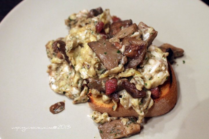 - In una ciotolina sbattere leggermente le uova e insaporirle con un pizzico di sale. Versarle sopra ai funghi e iniziare a mescolare fino a che non si saranno rapprese del tutto formando una morbida crema.