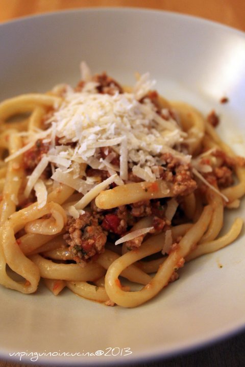 E così, domenica mattina mi ci sono messa. Ma visto che avevo invitato un’amica e non sapevo se sarei riuscita nell’impresa, ho messo in salvo il pranzo scongelando preventivamente il mitico ragù della mia Mami. Ovvero, io ci provo: se mi vengono, li condisco con il ragù, altrimenti faccio sempre in tempo a buttare dell’altra pasta che ho in casa. ;)