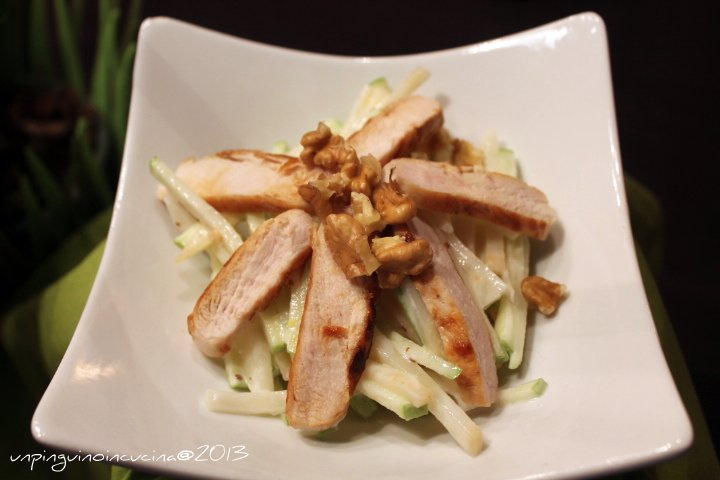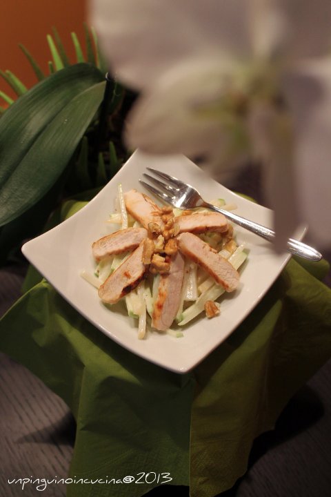 - Servire l'insalata di sedano e mele adagiandoci sopra le striscioline di pollo e cospargendo con i gherigli di noce spezzettati.