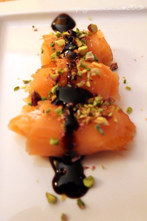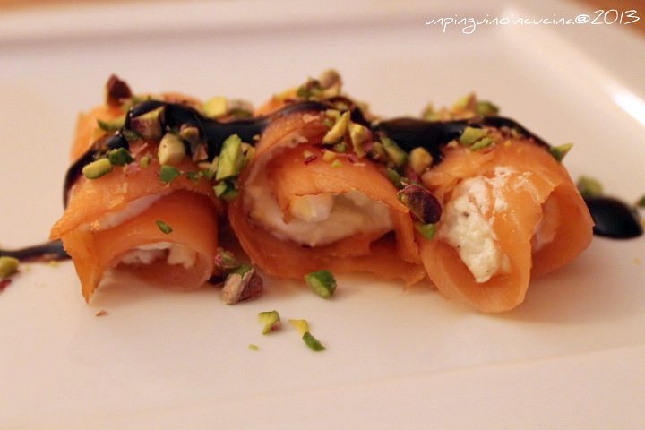 - Tritare i pistacchi grossolanamente e distribuirli sopra i rotolini di salmone allineati nel piatto.
