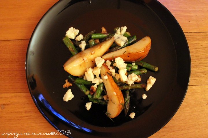 5. Nel piatto, preparare una base con gli asparagi e le noci, adagiare sopra gli spicchi di pera e il roquefort sbriciolato. Condire il tutto con la vinaigrette.