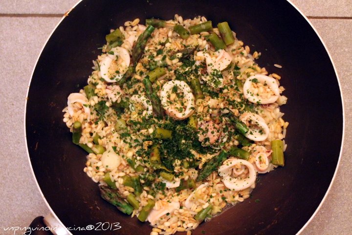Però oggi si ricicla davvero, anche nella cucina del Pinguino. Mezzo mazzo di asparagi avanzato da qui, qualche calamaro avanzato da qua, un fondo di scatola di cereali misti…beh, proviamo a mescolare il tutto e vediamo cosa ne esce. Mmmmm, buono…poche altre parole e il piatto era vuoto, spazzolato tutto. E anche stavolta la semplicità ha trionfato! Pssss, l’ho detto solo a voi che era tutto un riciclo ;)