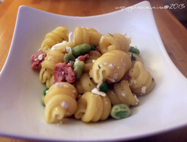 Così, mentre in una casseruola sobbolliva lentamente del ragù e nell’altra lessavo del pesce per preparare delle polpettine, si avvicinava l’ora di cena. Che fare? O meglio, cosa preparare per smaltire più roba possibile? Toh, un pezzetto di salsiccia di coniglio! E qui? Un pugnetto di fave e uno di piselli. Altri due sacchetti fatti fuori. E questo cos’è? Un pezzetto di ricotta salata…aggiudicato! (non mi chiedete perché surgelo il formaggio, perché ho milel piccoli avanzi, con fatta così, quel che non consumo, per non buttarlo lo surgelo! e gli avanzi? ogni tanto li perdo d’occhio, tutto qua…). Però alla fine ne è venuta fuori una bella ricetta e anche se non era serata da ricetta per il blog, non ho potuto fare a meno di condividerla con voi! :)