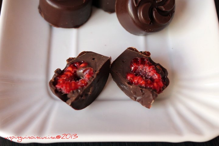 E’ a voi, quindi, che dedico questo mio primo anno di blog. A voi, che ogni giorno mi ispirate con le vostre creazioni, che avete saputo stimolare la mia creatività con i vostri contest, che mi avete saputo gratificare con i vostri commenti, la vostra presenza, il vostro pensiero. Vi abbraccio forte e offro a tutti un cioccolatino dell’amicizia, un contrasto di sapori (cioccolato fondente/lampone) come piace a me, con la frutta che – come avrete capito – mi piace infilare dappertutto, dolce o salato che sia.