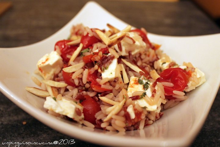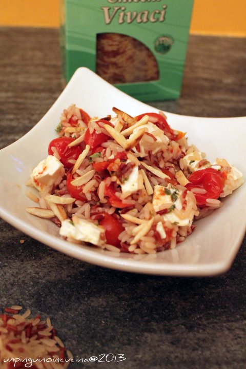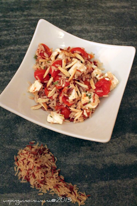 2. Aggiungere i pomodorini caramellati con il loro liquido di cottura e la feta sbriciolata. Tostare le mandorle in un padellino antiaderente e aggiungere anche queste al riso. Mescolare delicatamente.