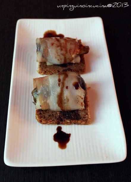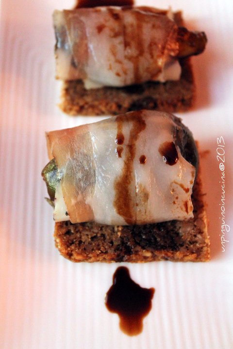 - Posizionare un involtino su ogni quadratino di pane e irrorare con poco liquido di cottura dei fichi.