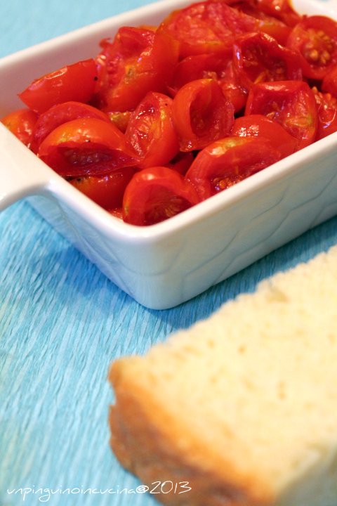 Ci sono sapori che fanno subito estate. Uno di quelli, secondo me, sono i pomodori freschi cotti (al forno, in padella, gratinati) e poi consumati a temperatura ambiente. Quelli che vi propongo oggi, con la loro leggera caramellatura (per nulla dolce, non aspettatevi nulla di stucchevole!), sono perfetti per qualsiasi prelibatezza vi possa venire in mente: bruschette, freselle, pizza, pasta, insalate di riso….o semplicemente così, al naturale o arricchiti con qualche aroma, con un pezzetto di pane casereccio per fare la scarpetta nel loro delizioso liquido ambrato.