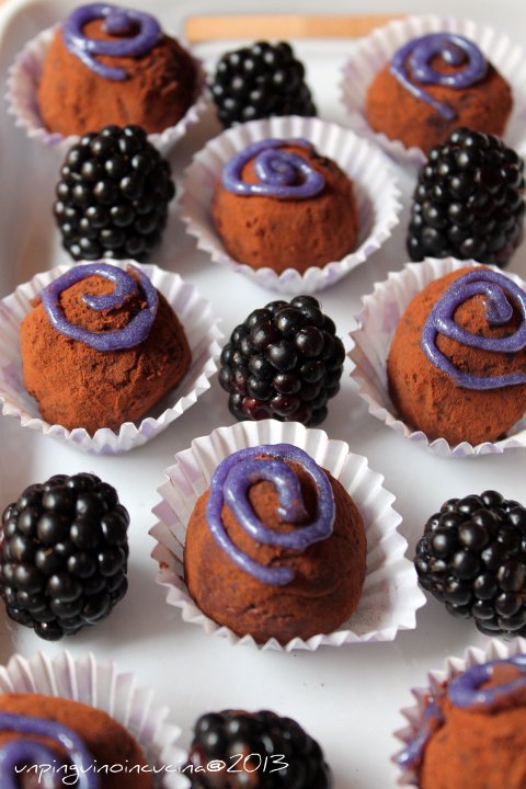 Ho avvistato questi tartufi su Pinterest, ultimamente grande fonte di ispirazione per me, mi diverto anche solo a vedere le immagini delle ricette e a immaginare come potrebbero essere realizzate. Comunque, tornando ai nostri tartufi alle more…perfetto equilibrio di sapori tra la dolcezza della marmellata all’interno e la nota amara del cacao esterno. Vi avviso, vanno via come le ciliegie!