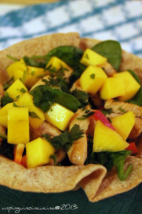 - Riempire le ciotoline di piadina con l'insalatina e cospargerla con le striscioline di pollo e i cubetti di mango. Ultimare con il coriandolo fresco tritato. Servire subito per evitare che le ciotoline si bagnino troppo.