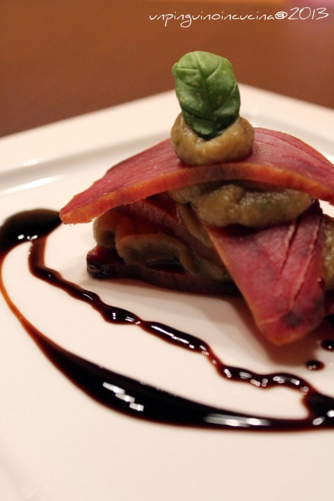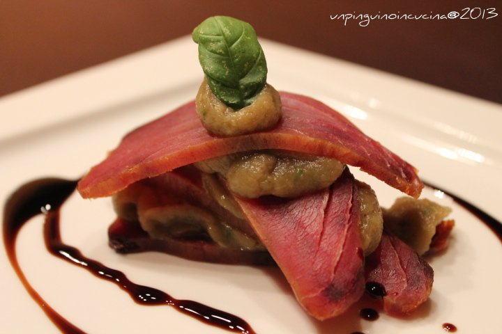 Millefoglie di mosciame di tonno e mousse di melanzane