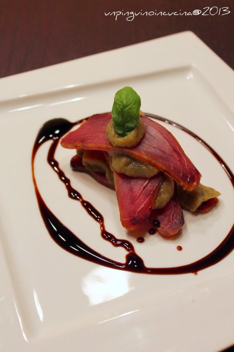 3. Comporre il piatto alternando fettine di mosciame di tonno con mousse di melanzane (io per fare un lavoro pulito ho usato un sac à poche). Finire con un filo d'olio extravergine d'oliva e un filo di glassa di aceto balsamico.