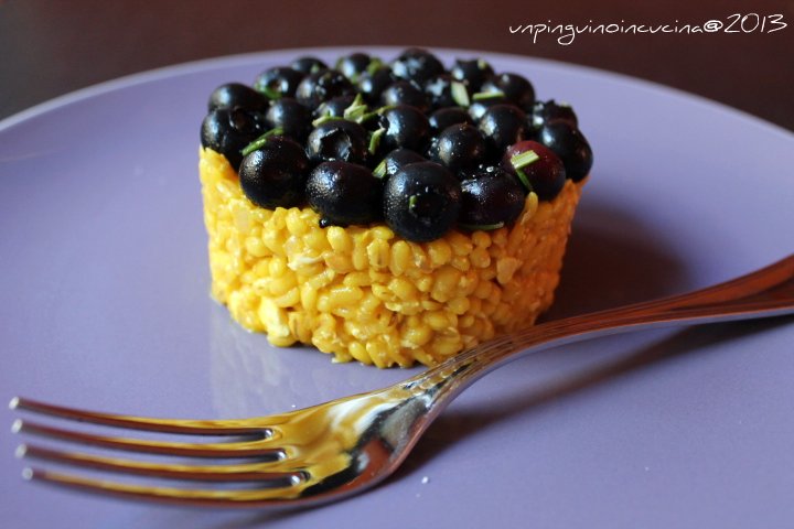 …ed ecco l’illuminazione! E se i mirtilli finissero nel riso “giallo”? (sono neri, ok, ma poi in fondo sono anche un po’ viola…mi ricordo certe bocche tutte viola dopo aver passato il pomeriggio a raccogliere e mangiare i mirtilli nei boschi!) Ma perché poi un risotto, facciamoci un bell’orzotto! :) Detto, fatto…e la cosa bella è che anche i nani, attirati dall’aspetto del piatto (“Che bello, mamma, cos’è?”) hanno gradito un sacco! Promesso, mamma lo rifarà presto!