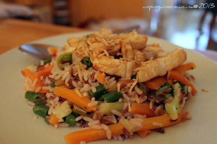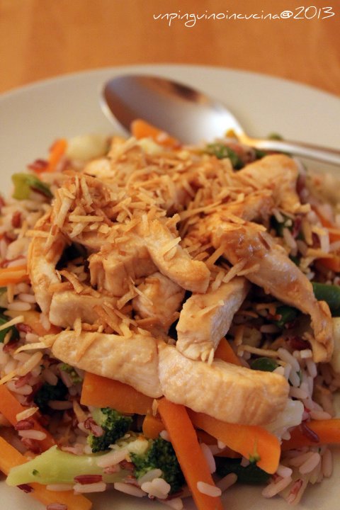 La sera, per una volta, la voglia di cucinare non era granché. Così ho optato per una facile e veloce padellata di verdure e pollo con riso (rigorosamente senza latticini ;). Ma ho voluto darle una piccola marcia in più, con l’aggiunta finale di un po’ di cocco grattugiato. Avevo in casa un sacchettino di piccoli filini di cocco disidratato che i miei mi hanno portato dalla Turchia (ma vanno bene anche le scagliette tipo quelle che si mettono nel muesli).