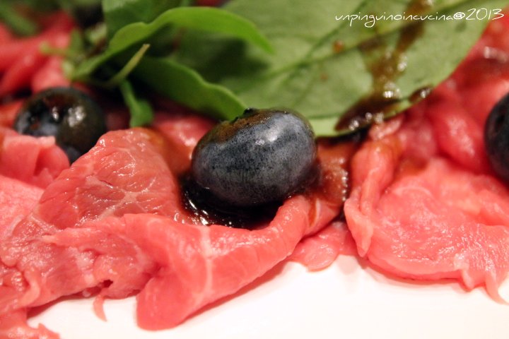 Però. in fondo, più che di fornelli avevo voglia di qualcosa di fresco e leggero per compensare qualche stravizio “montanarp” di troppo. E così, davanti a due belle vaschette di carpaccio di manzo freschissimo mi è venuta voglia di deviare rispetto al solito pomodorini e rucola e mi è cascato l’occhio sulla vaschetta di mirtilli. Wow, bello!, come direbbe il Patatone…ultimamente è la sua espressione preferita insieme alla domanda tormentone: “Oa faiiiii?” (cosa fai?).