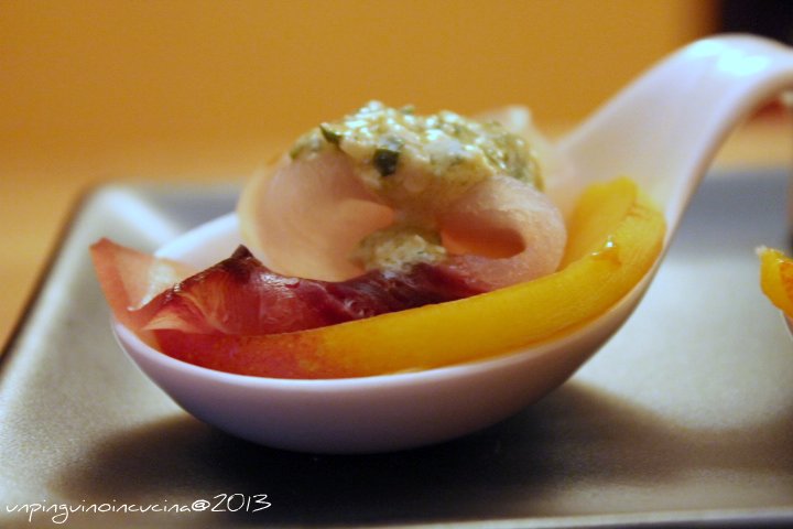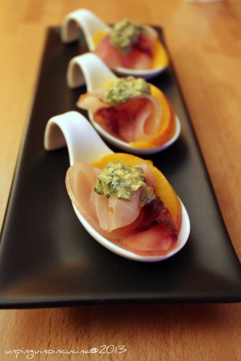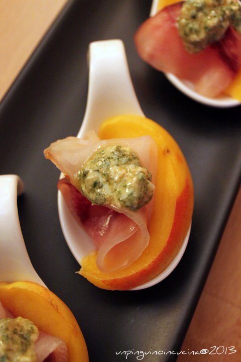 - Disporre le fettine di spada nei piatti alternandole alle fettine di pesca (o sui cucchiai monoporzione come ho fatto io) e condire con la salsa alla senape.