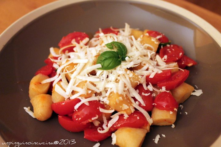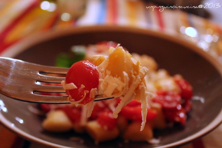 - Cuocere gli gnocchetti in acqua bollente salata, scolandoli man mano che vengono a galla e tuffandoli direttamente nella padella con il sughetto al pomodoro.
