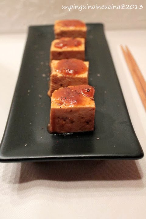 E allora, che ne dite oggi, per cambiare, di preparare un aperitivo orientale? Magari mentre state aspettando il sushi che avete ordinato… E allora, vai di cubi di tofu speziati! Finger food? Anche no, c’è la salsa, forse è meglio evitare. Potreste servirli su dei piccoli piattini con un paio di bacchette. Così quadrati e lisci è riuscito a tirarli su anche il gentil consorte che in genere maneggia le bacchette come un chirurgo i suoi ferri. Se non ce la fate, tranquilli, rimangono sempre le dita che anche il “bon ton del sushi” vede di buon occhio. ;)
