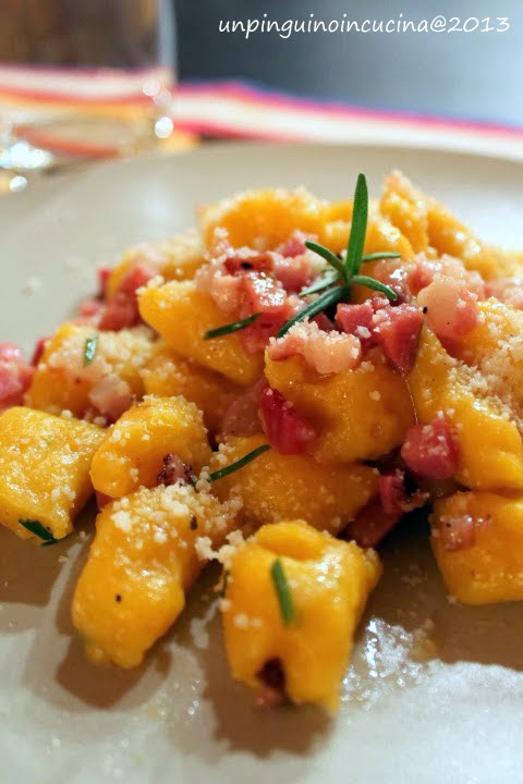 “Ops, mi sa che non ho abbastanza zucca per fare gli gnocchi che avevo in mente.” “Vado a prendere delle pizze?” “Ma no, aggiungo un po’ di patate…uhm, non ci sono neanche quelle.” “Inizio a prepararmi, eh?” “Ma no, dai, aspetta, adesso vedo come fare…” E così, mentre il gentil consorte si preparava per andare a prendere due pizze, io frullavo, impastavo, rotolavo, tagliavo…avvolta in una nuvola di farina. Alla fine, gli ho chiesto di aspettare che buttassi gli gnocchi in acqua per vedere come avrebbero reagito, prima di correre ai ripari…e così, alla faccia di chi non avrebbe puntato neanche un centesimo sui miei gnocchi, ho realizzato questo delizioso piattino. Malfidato! E voi, avete voglia di provarli?