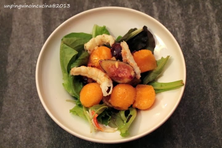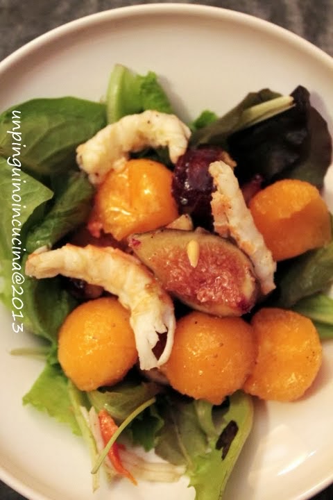 Della serie: diamoci dentro con la frutta estiva prima che sparisca dai banconi del mercato! Nulla contro mele, pere, uva e prugne, sia ben inteso. Anzi, faccio proprio fatica a individuare un frutto che non mi piaccia (ok, la banana in effetti non è che mi faccia impazzire) ma questa insalatina di scampi con le palline di melone e i fichi è davvero squisita! L’aggeggino per fare le palline di melone l’ho preso apposta per questa insalata…come direbbe il gentil consorte: ogni scusa è buona per comprare un nuovo attrezzo da cucina! ;)