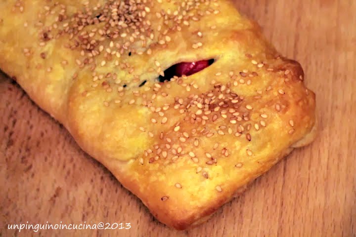 - Preparare un'emulsione con un cucchiaio di acqua, un cucchiaio di olio extravergine d'oliva, un pizzico di curcuma (servirà a "mimare" l'effetto giallo dell'uovo spennellato) e un pizzico di sale. Spennellare questa emulsione sullo strudel, inciderlo con tre tagli in diagonale per permettere al ripieno di sfiatare in cottura e spolverare con i semi di sesamo.