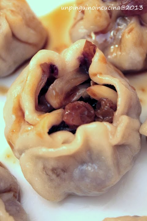 L’idea di fare dei ravioli al vapore mi frullava in testa già da un po’, ma non avevo voglia di riempirli né di carne né di pesce. Così deciso di accostare questo piatto tipicamente orientale ad un ripieno invece molto mediterraneo: radicchio con uvetta e pinoli. Ma non finisce qui: invece della solita salsa di soia, ho deciso di abbinare ai miei ravioli la salsa teriyaki già sperimentata qui. Il risultato? Un piatto deliziossimo, in cui l’amaro del radicchio (che il gentil consorte non ama particolarmente) viene addolcito sia dalla presenza dell’uvetta sia dall’accompagnamento della salsina dolce. Semplicemente meraviglioso! ^-^