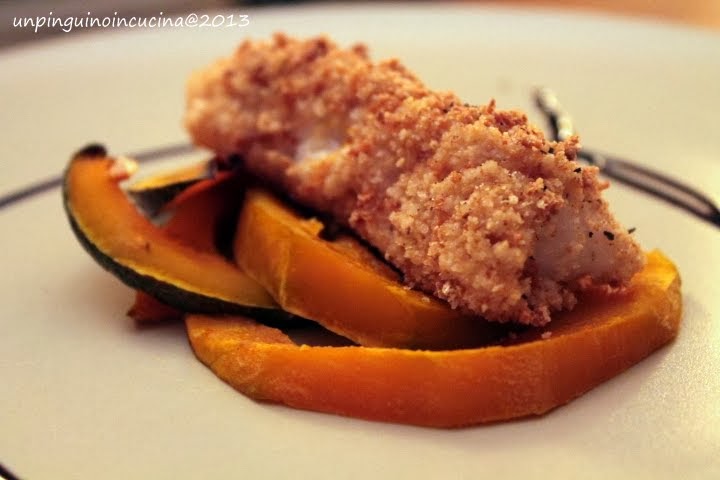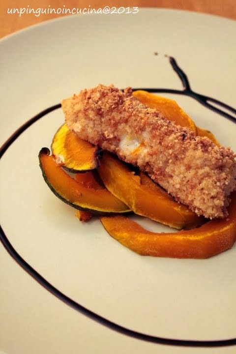 Bocconcini di nasello in crosta di amaretti con zucca al forno