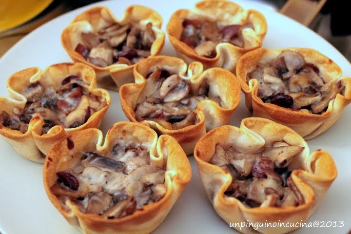 3. Unire il formaggio spalmabile ai funghi, mescolare bene e riempire i cestini di pasta.