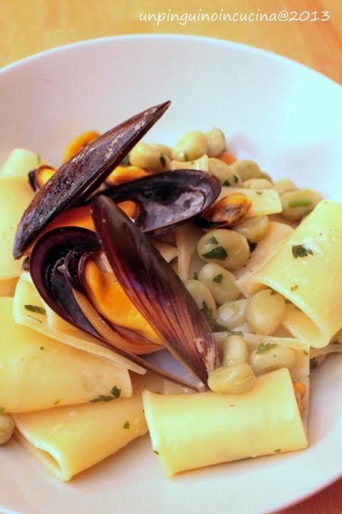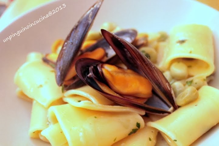- Nel frattempo, in una padella insaporire un filo d'olio extravergine d'oliva con l'altro spicchio d'aglio in camicia leggermente schiacciato. Unire le fave, le cozze e un po' dell'acqua che hanno rilasciato in cottura. Quando i paccheri sono cotti (al dente!), scolarli con una schiumarola e trasferirli nella padella. Spadellare un paio di minuti, spegnere e unire due generose manciate di pecorino. Mescolare bene, insaporire con un po' di prezzemolo tritato e servire.