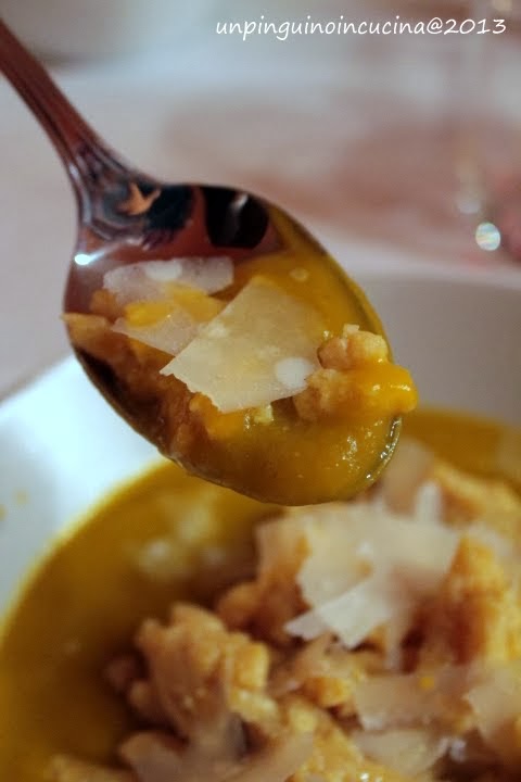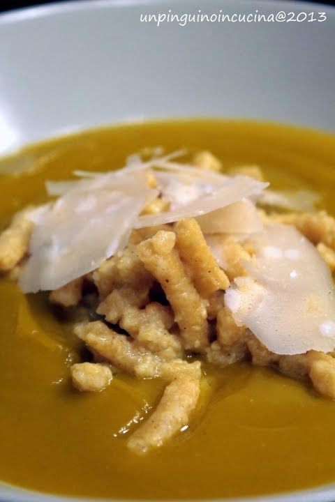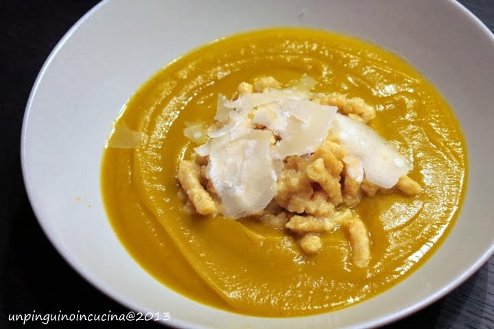- Nel frattempo, tagliare la zucca e la patata a tocchetti, farli tostare in una casseruola con un filo d'olio extravergine d'oliva e ricoprire con brodo vegetale fino ad arrivare a filo alla verdura. Coprire e lasciare sobbollire per 20 minuti. Frullare con un mixer a immersione, aggiustare di sale e di pepe e tenere in caldo.