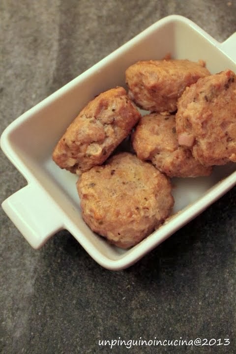- Riunire tutti gli ingredienti in una ciotola e amalgamarli bene (io uso le mani). L'impasto resterà molto umido. Resistete alla tentazione di aggiungere farina o pangrattato, vi assicuro che le polpette terranno perfettamente la cottura! Formare le polpette (a me ne sono uscite 7).