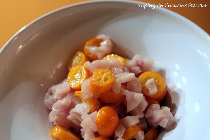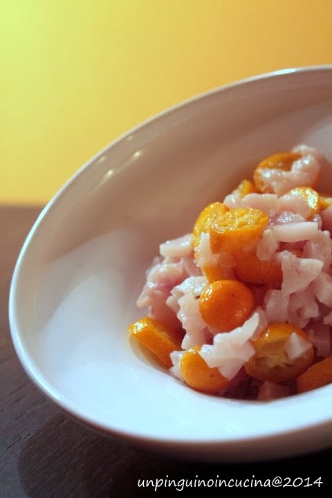 Comunque, tra le mille prelibatezze, c’era anche una vaschetta di kumquat. Ne ho assaggiato subito uno ma erano ancora molto acerbi e così li ho messi da parte, in attesa che arrivasse il loro momento. E il momento è finalmente arrivato! Così, prima sono finiti in una fresca tartare di pesce, a crudo. Poi, a breve, finiranno anche in cottura ma di quello vi parlerò più avanti (sempre che venga bene). Iniziamo a vedere bene, come ho preparato la tartare…