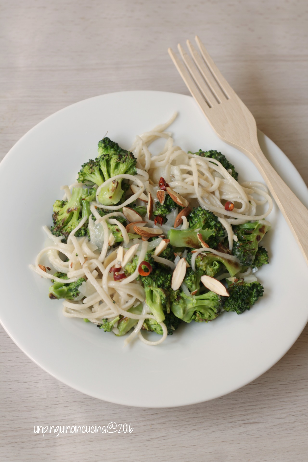Scolare la pasta e mescolarla con i broccoli al forno. Condire il tutto con la crema al limone e cospargere con le mandorle tritate grossolanamente e qualche fiocchetto di peperoncino.